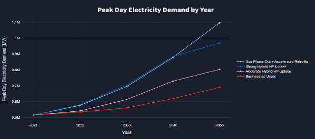 - Robust scenario modelling to explore how changes in the building stock affect energy demand, emissions, and seasonal peak loads